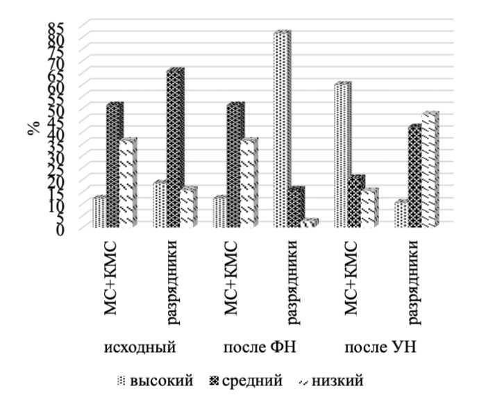 уровнями – уменьшает на 30 и 20 % соответственно. Умственная нагрузка после физической нагрузки в группе разрядников вызвала снижение доли спортсменов с высоким уровнем на 70 %, увеличение доли со средним уровнем – на 35 % и с низким уровнем ПЗМР – на 40 %.