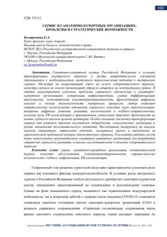 Сервис, санаторно-курортные организации, оздоровительный туризм, качество обслуживания, клиентоориентированность, стратегические возможности, wellness, цифровизация, PR-коммуникации