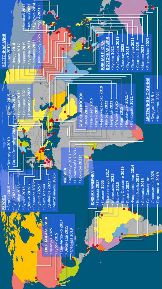 По состоянию на конец 2025 г. в перечень Сети креативных городов ЮНЕСКО (UCCN) по номинации «Гастрономия» включены 67 городов в 36 странах (рис. 1), каждый из которых привносит в «мировую кухню» свой неповторимый вкус. С точки зрения представленности географических макрорегионов, то в перечне преобладают Европа (16 городов), Южная Америка (12 городов), Восточная Азия (11 городов) и Ближний Восток (10 городов). При этом наибольшим числом включенных в перечень городов обладает Китай – 7 ед., также по 4 города включены в перечень от Бразилии, Испании и Турции. Важно отметить, что наименее представленными в перечне UCCN макрорегионами мира являются Австралия и Океания (2 города в Австралии) и Африка (по 1 городу в Бенине, Камеруне и ЮАР). По степени известности в перечне UCCN по номинации «Гастрономия» явно преобладают небольшие и малоизвестные города, в которых вопреки влиянию технологизации и прочих явлений глобализации удается сохранять местные традиционные кухни и соблюдать рецептуру в производстве местных специалитетов. Из крупных и/или широко известных городов, включенных в перечень по номинации «Гастрономия», можно отметить такие, как Панама-Сити (Панама), Белем и Белу-Оризонти (Бразилия), Берген (Норвегия), Сарагоса (Греция), Руан (Франция), Санкт-Петербург (Россия), Салоники и Ираклион (Греция), Медина (Саудовская Аравия), Макао/Аомынь (Китай), Пхукет (Таиланд). Это подтверждает также факт того, что абсолютное большинство «гастрономических» городов – претендентов на включение в перечень UCCN, рассматривают факт их признания как центра мировой гастрономии в качестве способа более широкого своего продвижения, прежде всего на рынке мирового гастрономического туризма, стремясь войти в число туристских дестинаций через собственную репрезентацию в авторитетных перечнях и списках, коим, без сомнения, является и список программы «Сеть креативных городов ЮНЕСКО» по номинации «Гастрономия».