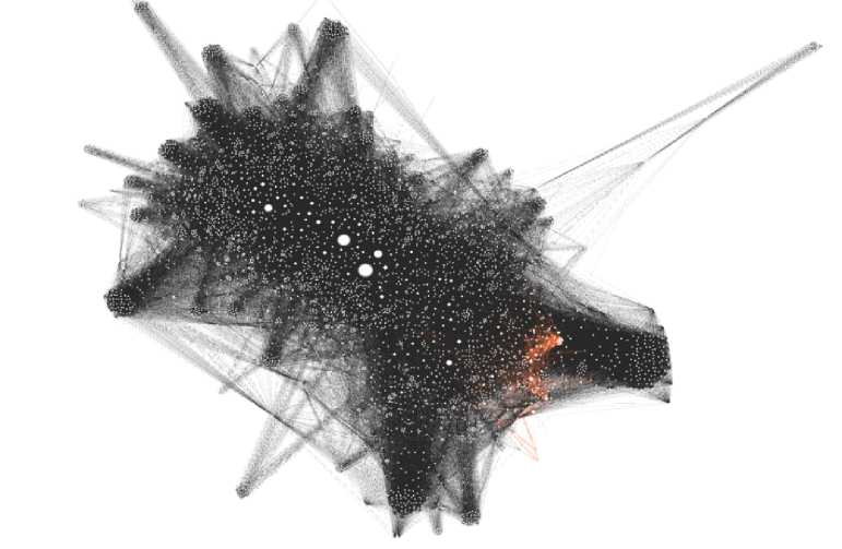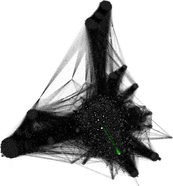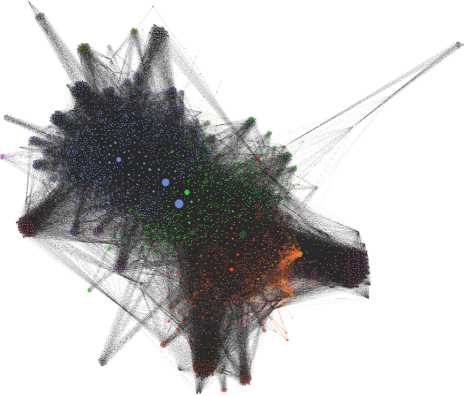 Размер узлов пропорционален их взвешенной степени (суммарному весу связей пользователя). Вариация структуры сообще- ства позволила выделить несколько круп-