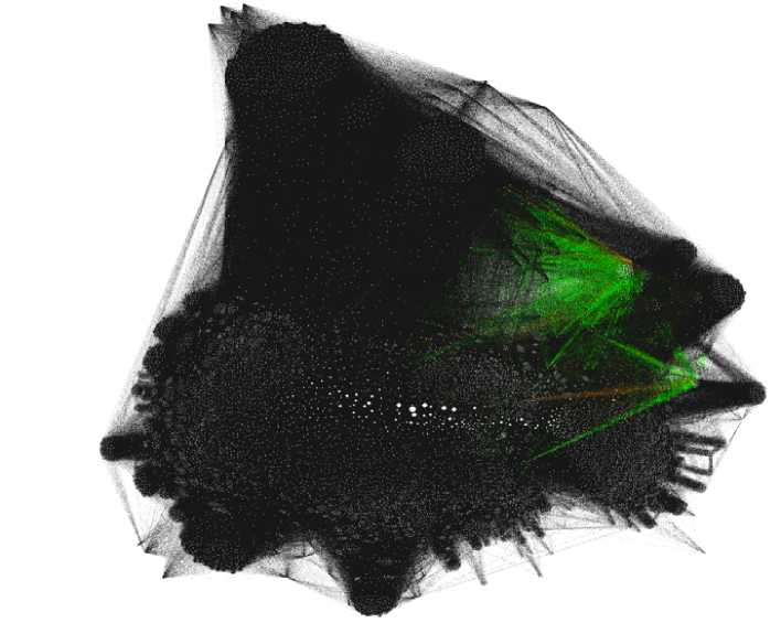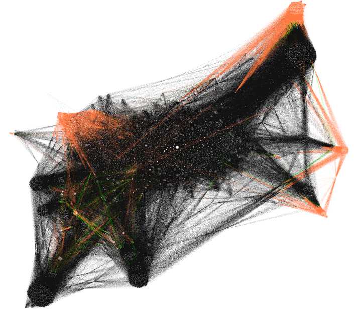 Волонтерское сообщество «Волонтеры | Добровольцы | Тюмень» включает 5 151 участника и 162 023 связи между ними (табл. 1) . Основной тип взаимодействия – лайки, которые составляют 97,9% от общего числа ребер. Комментарии фиксируются лишь в 2,1% случаев, а комбинированные взаимодействия (лайк + комментарий) крайне редки – 0,06%. Структурная визуализация сети демонстрирует ярко выраженное преобладание лайков (черные ребра), в то время как комментарии (оранжевые ребра) и комбинированные связи (зеленые ребра) представлены незначительно.
