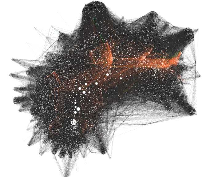 Рис. Сеть коммуникативной активности сообщества «Волонтеры | Добровольцы | Тюмень». Размер вершин пропорционален взвешенной степени (Weighted Degree). Цвет ребер кодирует тип взаимодействия: лайк – черный, комментарий – оранжевый, лайк + комментарий – красный. Веса ребер: лайк = 0,2; комментарий = 0,6;