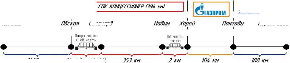 Согласно проекту концессионного соглашения Российская Федерация (в лице Росжелдор) выступает концедентом, а концессионером определена специальная проектная компания (далее СПК-Концессионер) — дочернее общество ОАО »РЖД». Финансирование проекта будет осуществляться за счет концессионного соглашения, СПК-Концессионер за счет собственных и привлеченных средств построит железнодорожную часть мостового перехода через реку Обь с железнодорожными подходами; участок железной дороги Салехард – Надым (Хорей); железнодорожную часть мостового перехода через реку Надым. ОАО «РЖД» профинансирует развитие железнодорожных подходов к СШХ со стороны Свердловской и Северной железных дорог. ПАО «Газпром» будет финансировать развитие ж.д. участка Хорей– Пангоды.