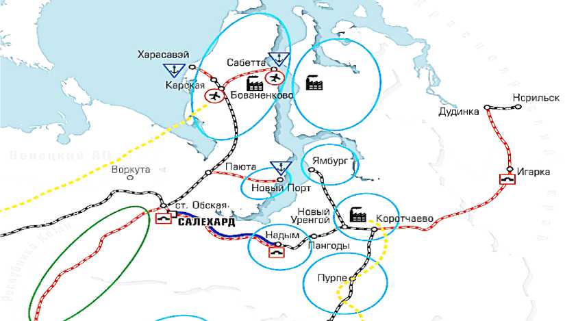 Масштабный инфраструктурный проект предоставит возможность вывозить грузы с месторождений на Ямале, планируемый грузопоток оценивается почти в 24 млн т/в год грузов. В основном это — газовый конденсат. Россия получит связь между городами севера, соединение существующих железных дорог, а также развитие Севморпути. Обратно пойдут строительные материалы, техника, средства снабжения и обеспечения, продукты и многое другое. Также новая дорогая сделает рентабельной разработку нескольких крупных месторождений региона, которые сейчас считаются труднодоступными. В перспективе до 2030 г предусматривалось продолжить магистраль от Коротчаево на восток до Игарки через ЮжноРусское нефтегазовое месторождение (НГМ) и Ермаково. Протяженность магистрали: Коротчаево – Южно-Русское НГМ – 122 км; Южно-Русское НГМ – Игарка – 482 км. В качестве еще более дальней перспективы планировалось строительства железной дороги Игарка – Дудинка (Рисунок 3).