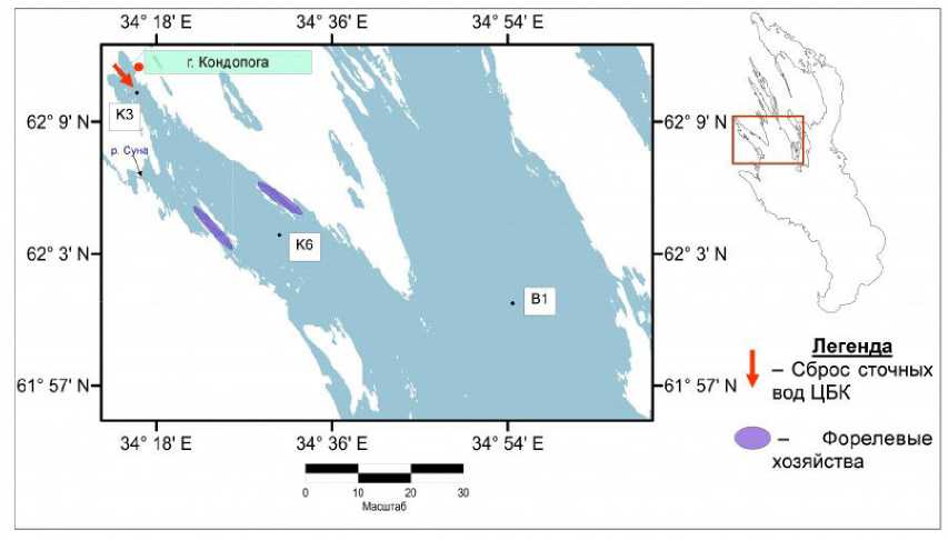 Кондопожский залив характеризуется значительной многолетней антропогенной нагрузкой (Калинкина и др., 2021; Зобкова, 2024). В вершинной части залива (см. рис. 1, станция K3) расположен целлюлозно-бумажный комбинат, сточные воды которого проходят биологическую очистку и сбрасываются в залив, благодаря чему здесь наблюдаются высокие концентрации растворенных и взвешенных органических веществ и общего фосфора (Калинкина и др., 2011), что благоприятно влияет на развитие кормовой базы зоопланктона. Объем сточных вод в 2019–2020 гг. в среднем составил около 47 млн м3/год (Государственный доклад…, 2021). С начала 1990-х гг. по настоящее время фосфорная нагрузка сточных вод значительно сократилась - с 109 до 12 т/год (Тимакова и др., 2014; Литвинова и др., 2021). В центральной части залива (см. рис. 1, станция K6) расположено 11 форелевых хозяйств с общей мощностью 3870 т/год (Смирнова и др., 2024). Кроме того, по сравнению с дру- гими крупными заливами Онежского озера, в Кондопожском заливе водообмен с открытым плесом более ограничен (Галахина, Зоб-ков, 2022), а период условного водообмена составляет 1.03 года (Лозовик и др., 2019). Залив Большое Онего характеризуется свободным водообменом с центральным плесом Онежского озера, олиготрофным статусом, высоким качеством воды и низким (P 7–10 мкг/л) содержанием биогенных общ элементов (Крупнейшие озера-водохранилища…, 2015; Теканова и др., 2019).