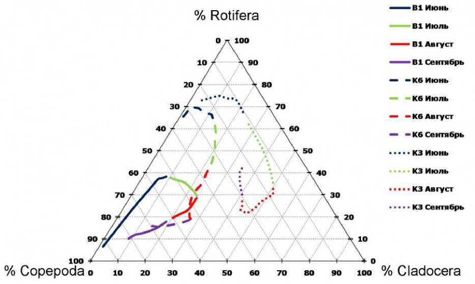 Сезонные изменения видового состава зоопланктона лежат в основе динамики соотношения основных его групп. Общие закономерности сезонных изменений структуры сообществ зоопланктона, без влияния межгодовой изменчивости, можно представить в виде треугольной диаграммы (рис. 2). Детализация диаграммы сезонных изменений структуры сообществ по месяцам вегетационного периода представлена в табл. 2–5.