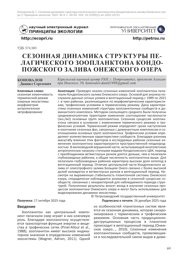 Проведен анализ сезонных изменений зоопланктона пелагиали Кондопожского залива Онежского озера. Основой для анализа послужили данные сетных уловов в вегетационный период с 1989 по 2021 г. в трех районах, различающихся по морфометрическим характеристикам, трофическим условиям и термическому режиму. Дана характеристика сезонных изменений структуры зоопланктонных сообществ и доминантного комплекса. Методом скользящего среднего были получены среднемноголетние траектории изменения соотношения численности (экз./м2) основных групп зоопланктона. Сезонная сукцессия зоопланктона связана в основном с изменением термического режима и трофических условий. Термический режим определяет сроки наступления и окончания сезонных фаз, связанных с доминантным комплексом и соотношением основных групп зоопланктона. Трофические условия определяют количественные характеристики сообществ. Благодаря разному масштабу влияния этих факторов в исследуемых районах сезонные изменения зоопланктона характеризуются пространственной неоднородностью. В мелководной вершинной части, испытывающей многолетнюю антропогенную нагрузку сточными водами Кондопожского ЦБК, период с преобладанием ветвистоусых рачков длится дольше, чем в пелагиали глубоководных районов, а общая численность зоопланктона выше. Для пелагиали глубоководных районов характерна высокая доля копепод в вегетационный период. Отличие центральной части Кондопожского залива от олиготрофного залива Большое Онего связано с более высокой долей коловраток и ветвистоусых рачков в вегетационный период. Несмотря на выраженную стабильность планктонной системы Онежского озера, спорадически наблюдаются аномалии в сезонной сукцессии сообществ, связанные с нехарактерной для наблюдаемого периода структурой. Полученные результаты вносят вклад в изучение сезонных процессов зоопланктона Онежского озера и могут быть использованы для моделирования динамики экосистемы.