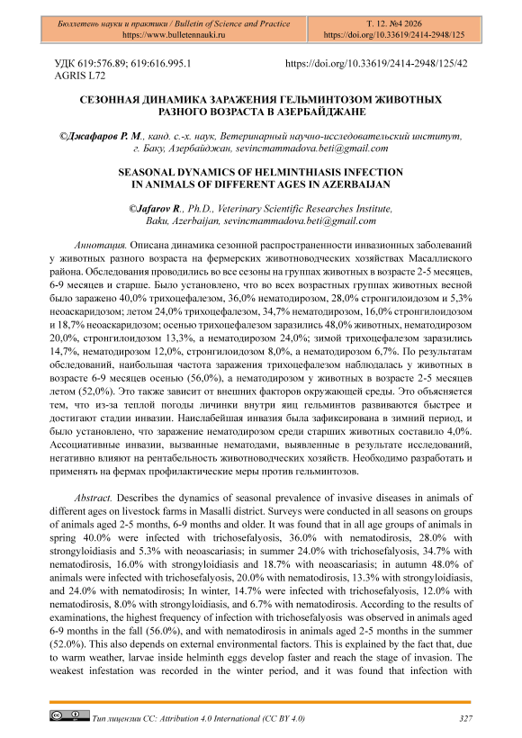Описана динамика сезонной распространенности инвазионных заболеваний у животных разного возраста на фермерских животноводческих хозяйствах Масаллиского района. Обследования проводились во все сезоны на группах животных в возрасте 2-5 месяцев, 6-9 месяцев и старше. Было установлено, что во всех возрастных группах животных весной было заражено 40,0% трихоцефалезом, 36,0% нематодирозом, 28,0% стронгилоидозом и 5,3% неоаскаридозом; летом 24,0% трихоцефалезом, 34,7% нематодирозом, 16,0% стронгилоидозом и 18,7% неоаскаридозом; осенью трихоцефалезом заразились 48,0% животных, нематодирозом 20,0%, стронгилоидозом 13,3%, а нематодирозом 24,0%; зимой трихоцефалезом заразились 14,7%, нематодирозом 12,0%, стронгилоидозом 8,0%, а нематодирозом 6,7%. По результатам обследований, наибольшая частота заражения трихоцефалезом наблюдалась у животных в возрасте 6-9 месяцев осенью (56,0%), а нематодирозом у животных в возрасте 2-5 месяцев летом (52,0%). Это также зависит от внешних факторов окружающей среды. Это объясняется тем, что из-за теплой погоды личинки внутри яиц гельминтов развиваются быстрее и достигают стадии инвазии. Наислабейшая инвазия была зафиксирована в зимний период, и было установлено, что заражение нематодирозом среди старших животных составило 4,0%. Ассоциативные инвазии, вызванные нематодами, выявленные в результате исследований, негативно влияют на рентабельность животноводческих хозяйств. Необходимо разработать и применять на фермах профилактические меры против гельминтозов.