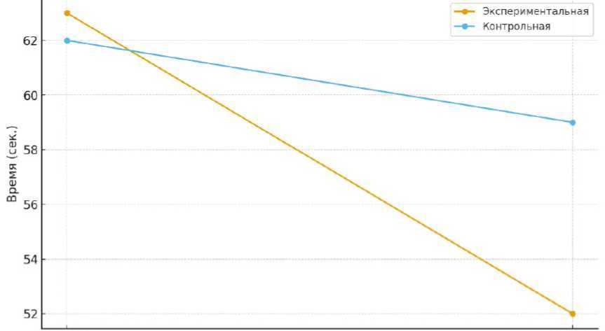 Результаты диагностики внимания показали различную динамику в экспериментальной и контрольной группах. На этапе исходного обследования показатели по таблицам Шульте были сопоставимы: время выполнения составляло 63 с в экспериментальной и 62 с в контрольной группе, среднее число ошибок — 3,1 и 3,0 соответственно. По завершении учебного цикла у детей экспериментальной группы зафиксировано снижение времени выполнения до 52 с (–17%) и уменьшение количества ошибок до 2,1 (–32%), тогда как в контрольной группе улучшения были существенно ниже (–5% по времени и – 7% по ошибкам) (рис.1).