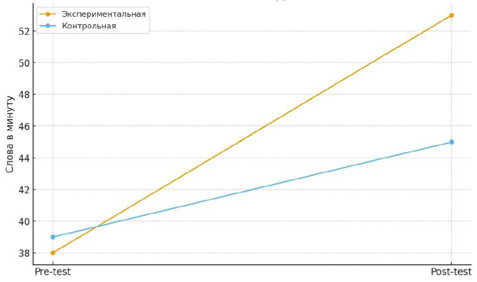 Учебные достижения также продемонстрировали различия в динамике. Результаты проверочных работ по математике увеличились в экспериментальной группе на 12%, в контрольной — на 4%; наибольший прирост был связан с заданиями, предполагающими выбор способа решения. Показатели техники чтения возросли с 38 до 53 слов в минуту (+15 ед.) в экспериментальной группе и с 39 до 45 слов (+6 ед.) — в контрольной. Кроме того, наблюдалось повышение точности понимания текста (+12 п. п. против +5 п. п.). Статистическая обработка показала значимые межгрупповые различия (p<0,05), причём величина эффекта по ряду показателей находилась в интервале от малых к средним (d ≈ 0,5–0,7). Полученные данные свидетельствуют о переносе сформированных когнитивных приёмов на учебные виды деятельности (рис.2).