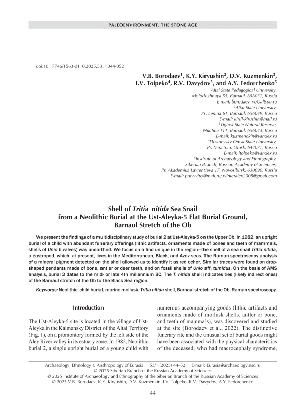 We present the findings of a multidisciplinary study of burial 2 at Ust-Aleyka-5 on the Upper Ob. In 1982, an upright burial of a child with abundant funerary offerings (lithic artifacts, ornaments made of bones and teeth of mammals, shells of Unio bivalves) was unearthed. We focus on a find unique in the region—the shell of a sea snail Tritia nitida, a gastropod, which, at present, lives in the Mediterranean, Black, and Azov seas. The Raman spectroscopy analysis of a mineral pigment detected on the shell allowed us to identify it as red ocher. Similar traces were found on dropshaped pendants made of bone, antler or deer teeth, and on fossil shells of Unio aff. tumidus. On the basis of AMS analysis, burial 2 dates to the mid- or late 4th millennium BC. The T. nitida shell indicates ties (likely indirect ones) of the Barnaul stretch of the Ob to the Black Sea region.