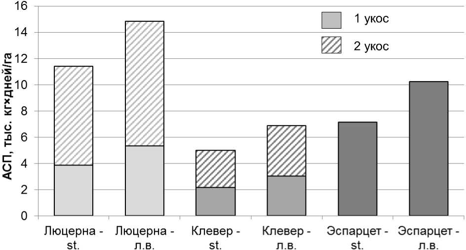Посевы эспарцета песчаного по размерам симбиотического потенциала заняли промежуточное положение между клевером луговым и люцерной синегибридной. Объемы ОСП варьировали в пределах 7450…10530 кг×дней/га,