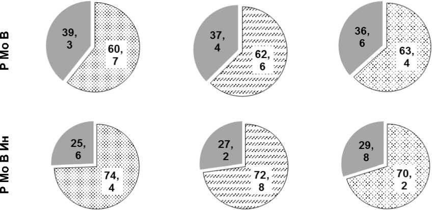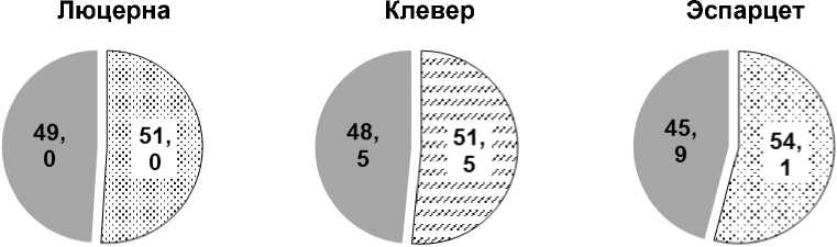 Рисунок 3 - Доля фиксированного азота воздуха в питании многолетних бобовых трав, % , ( сплошной сектор - почва, зернистый сектор - воздух )