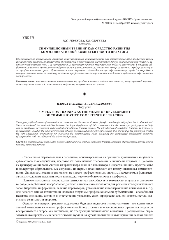 Коммуникативная компетентность, профессиональная подготовка педагога, симуляционный тренинг, симулятор педагогической деятельности, нейросеть, эмоциональное выгорание