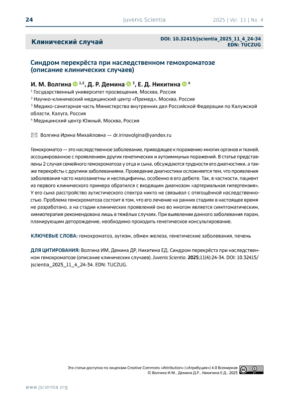 Представленные клинические случаи с учетом родства пациентов имеют общие механизмы развития, но различные клинические проявления. В случае отца гемохроматоз осложнился вторичной гипертензией и сочетался с синдромом Жильбера, у сына — сочетался с расстройством аутистического спектра и также с синдромом Жильбера. Для минимизации проявлений гемохроматоза и его осложнений необходима своевременная диагностика заболевания с последующей коррекцией обмена железа в течение всей жизни. Парам, планирующим беременность, при подтверждении диагноза гемохроматоза у одного из супругов необходимо пройти предварительное генетическое консультирование для уменьшения рисков развития наследственной патологии у детей.