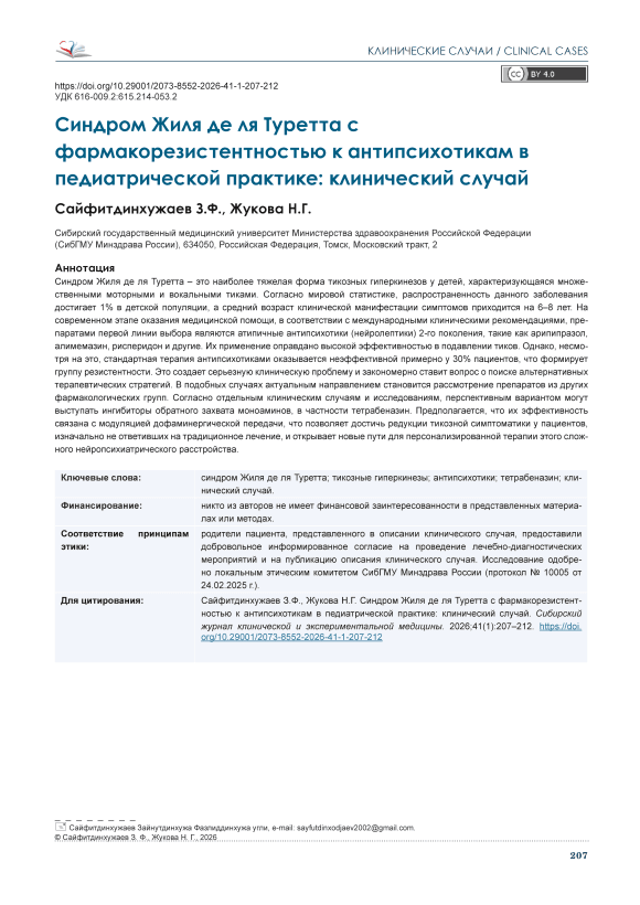 Синдром Жиля де ля Туретта – это наиболее тяжелая форма тикозных гиперкинезов у детей, характеризующаяся множественными моторными и вокальными тиками. Согласно мировой статистике, распространенность данного заболевания достигает 1% в детской популяции, а средний возраст клинической манифестации симптомов приходится на 6–8 лет. На современном этапе оказания медицинской помощи, в соответствии с международными клиническими рекомендациями, препаратами первой линии выбора являются атипичные антипсихотики (нейролептики) 2-го поколения, такие как арипипразол, алимемазин, рисперидон и другие. Их применение оправдано высокой эффективностью в подавлении тиков. Однако, несмотря на это, стандартная терапия антипсихотиками оказывается неэффективной примерно у 30% пациентов, что формирует группу резистентности. Это создает серьезную клиническую проблему и закономерно ставит вопрос о поиске альтернативных терапевтических стратегий. В подобных случаях актуальным направлением становится рассмотрение препаратов из других фармакологических групп. Согласно отдельным клиническим случаям и исследованиям, перспективным вариантом могут выступать ингибиторы обратного захвата моноаминов, в частности тетрабеназин. Предполагается, что их эффективность связана с модуляцией дофаминергической передачи, что позволяет достичь редукции тикозной симптоматики у пациентов, изначально не ответивших на традиционное лечение, и открывает новые пути для персонализированной терапии этого сложного нейропсихиатрического расстройства.