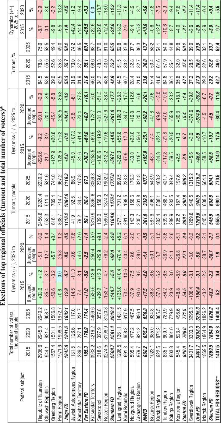 The monitoring methodology provides particularly comprehensive insights through extensive empirical data presentation that surpasses standard media coverage and official CEC statements. This includes detailed breakdowns by region and regional capitals, covering voter turnout and support for winning candidates through both relative (%) and absolute (number of people) metrics. The analysis further examines these figures as percentages of both total turnout and the overall electorate, while maintaining comparative continuity with previous electoral results from the same territories.