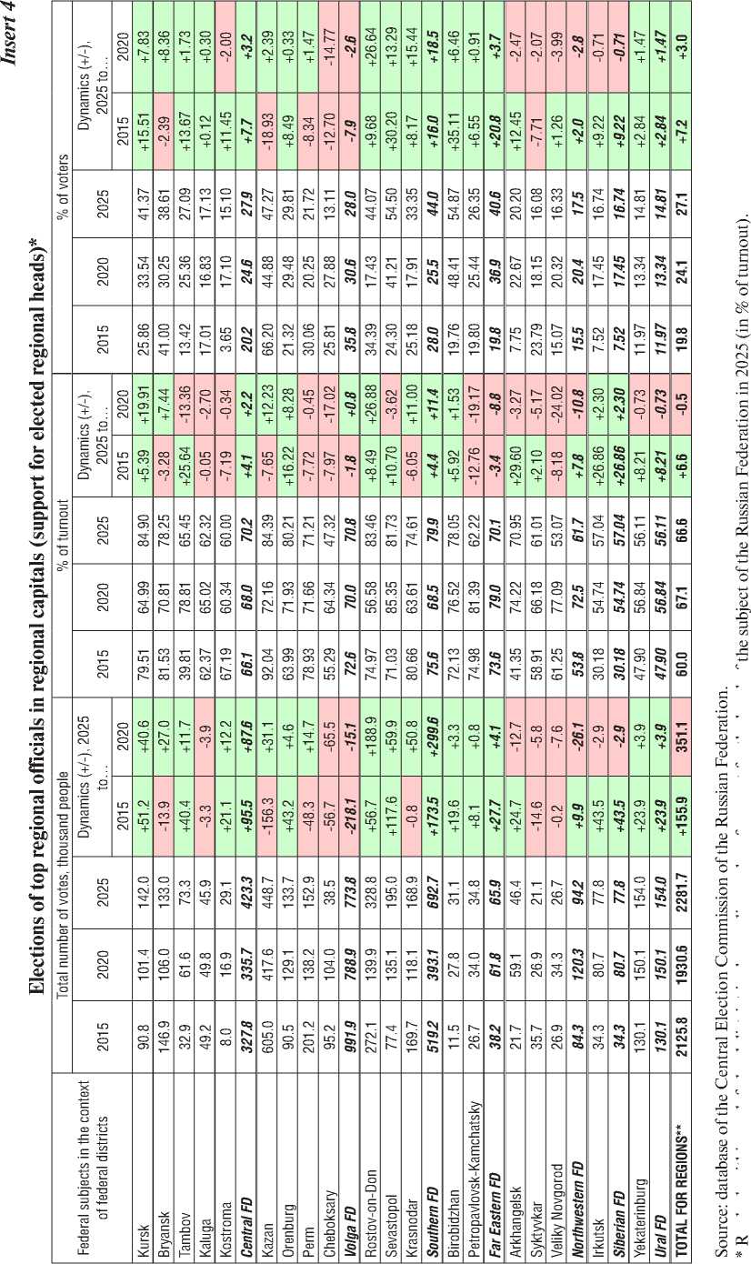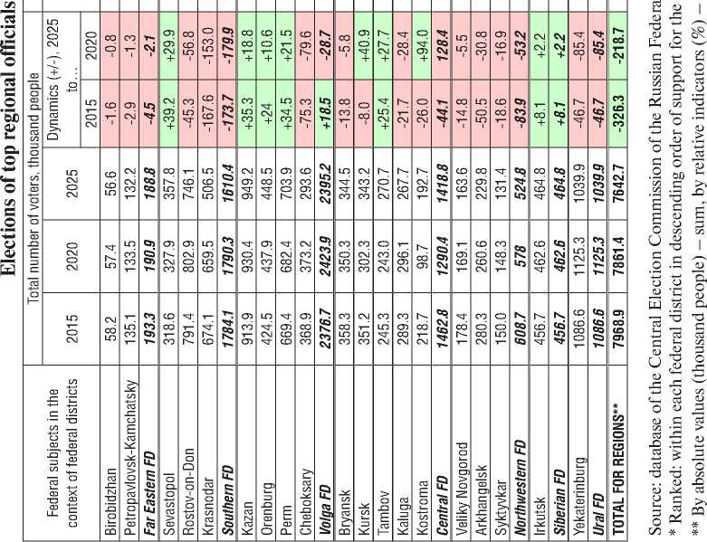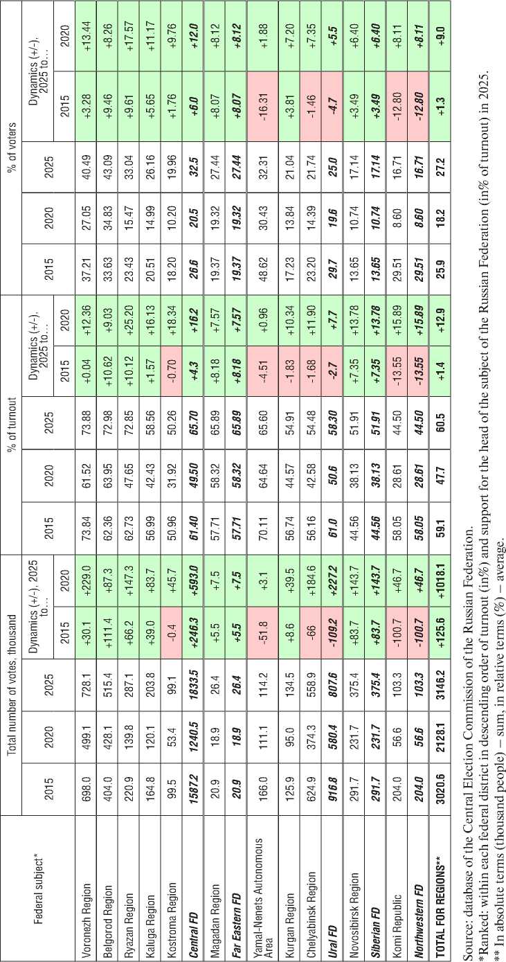 From September 12 to 14, 2025, Russia held its annual Single Voting Day, featuring elections at regional and municipal levels. This electoral campaign was widely seen as a “dress rehearsal” for the 2026 State Duma elections, and many experts concluded that this “test was passed successfully”. However, for several years now, some analysts have pointed out that local elections are increasingly becoming a formality, losing their potential as a tool for diagnosing the relationship between society and the authorities. This article presents the key findings of a long-term monitoring project of regional election campaigns, conducted since 2018 as part of the Editorial column, which includes a comparative analysis of sociological data on public attitudes towards the country's main political parties. As a stage in this monitoring, an in-depth analysis of the 2025 Single Voting Day results is provided: using official data from the Russian Central Election Commission, voter turnout and support for United Russia across regions and regional capitals are analyzed; a review of expert opinions on the concluded campaign is presented; and its specific features in 2025 are examined, including in the context of the geopolitical and civilizational challenges Russia has faced throughout the 21st century and especially since the start of the special military operation. Furthermore, the article continues its monitoring of key managerial decisions made by the President, the State Duma, and the Government. Particular attention is paid to analyzing expert opinions, criminal statistics, and actual instances of detentions of representatives of the ruling “elites”, which indicates a persistent and growing problem of their disconnect from the publicly declared, nationally-oriented development agenda of the Russian Federation, as articulated by the head of state. The authors highlight expert views that public trust in the political elite continues to raise significant and substantial questions. Despite the importance of internal political stability amid a tense international situation and ongoing hostilities within the framework of the SMO, the political system is not yet effective enough in fulfilling its role to meet the public demand for forming a Vision of Russia's Future and a new Social Contract that aligns with the President's stated goals of strengthening traditional values and the core principles of a genuine social state.