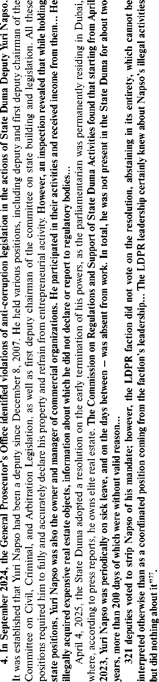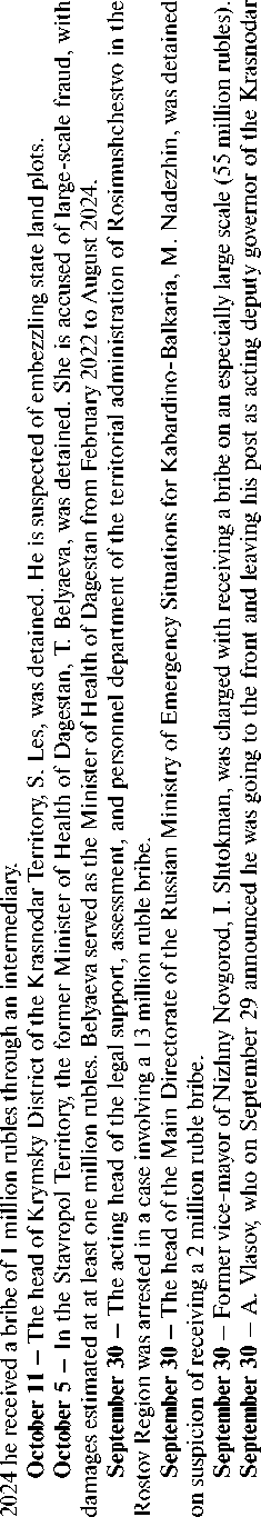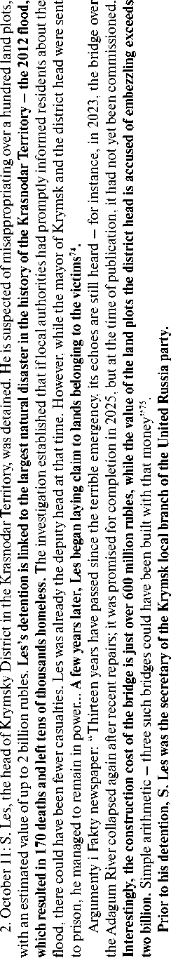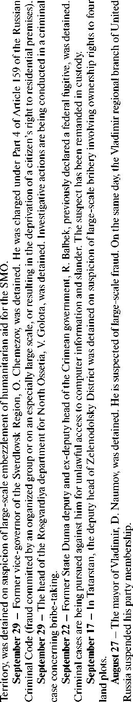 S -Н ад с Ф ’Й ф я W S ■о 2 ы я ’я ф ф S ф ф я W ф ф .5 я ,Я ей ь о ф я я ф ф in с о Й о 5 g й я Ё ад с о й й я g с й О ^ о ^ о й о Й х 3 N с в? о е X о с о о й о й Й е 3 е о О Й е § ^ й о о й с 5Р й я о >л -с Ё © «Ь U V 77 Ivanov A. A long-term deputy of the State Duma is suspected of raping a young assistant. Available at: https://zavtra.ru/events/mnogoletnego_deputata_gosudarstvennoj_ dumi_podozrevayut_v_iznasilovanii_yunoj_pomoshnitci?ysclid=mgrmbw658c102524228 78 Panteleev D., Zykina T., Sarsania N. “Organized criminal group and assets worth 9 billion rubles”: what is known about the lawsuit against the head of the Council of Judges. Available at: https://www.rbc.ru/business/23/09/2025/68d26a509a79476cc45d7597 ш ф О ф ф ы S3 5 ф ф g S3 ф сл Ф ф ф л сл С S3 ф ф д ■с? Е о я д д д д о д о о д о Е с д о Е S 2 д о 8 й1 д о о о д о £ д га 5 о V о д д о й Е N д р о д о 00 о д N N о V О д о д Е о? Е о д о Е -Н сю С О д Е о д о д .о Е Е с о д Ф о о й1 д д 'оо ай s' Е д Q д д S N д о д о д Е о ф Source: RT in Russian. The latest news about arrests. Available at: However, as V. Matviyenko, Chairwoman of the Federation Council of the Russian Federation, rightly notes, “all current conflicts, including the Ukrainian one, have a chance of resolution only if their root causes are eliminated”80. This thesis is often voiced concerning international conflicts, but, as the results of this study show, it is fully applicable to the country’s internal life as well. It is necessary to understand that under the conditions of the SMO, all events, phenomena, and processes occurring within the country should be viewed not only as part of internal daily life but also in the context of their potential external, geopolitical consequences. In this sense, the consolidating function of the ruling party as the “instrument for implementing the president’s policy”81 plays a crucial role in fulfilling one of the key tasks facing the country – the formation of a new Social Contract as a “basic, yet at the same time special state of relations between the state and the people, expressed in the philosophy of a common destiny”82. And although this task is not explicitly formulated by the head of state, numerous expert assessments testify to the growing need of Russian society for a new Social Contract.838485 1. “The conduct of the SMO, along with active and contradictory processes of socio-cultural turbulence within Russia and in Near Abroad states, requires adjustments to the existing social contract”83. 2. “As a result of the global transformation of the geopolitical system in 2022, the problem of a radical revision of the social contract emerged... The initiated shifts signify a fundamental change in the country’s governance regime – from a dependent (colonial) one to an independent (sovereign) one... The need for forming a qualitatively different social contract between the supreme authority of Russia, represented by its president (and simultaneously the leader of the nation!), and the population has already ripened”84. 3. “...currently, solutions to specific state and societal problems in a significant number of cases lead to distorted processes and phenomena, which do not always embody the equal unity of the people and the political power, leading to various forms of tension reflecting the deformation of the existing Social Contract”85. 4. “For many years, a discussion about the necessity of creating and introducing a common ideological platform into society has been intensifying in the country. This platform should serve as a guiding thread for state development... At the current civilizational rupture experienced by the world, we need such a guiding thread more than ever... A more or less clear outline, let alone one approved at the state level and purposefully, yet creatively (through discussions and probable corrections), proposed to broad elite circles and introduced into public consciousness, does not yet exist... The state’s leadership stratum is still dominated by economist-technocrats, ‘political technologists’. They are useful for current management, they do much that is necessary, but they are incapable of leading the country and the people towards new horizons, of ensuring a deep, ideological unity between the people and the authorities in the difficult, fateful struggle which the country and the world have entered... The above is not a call for a change of the supreme authority, especially during an acute foreign policy crisis, which will last for many more years. But the renewal of the governing elites is a mandatory condition for success”86. Nevertheless, as the research results show, the unconditional victory of the ruling party (70–75%) in regional and municipal elections is, in fact, secured by only about half (45–50%) of all eligible voters. The remaining portion of the population (judging by sociological survey data) either supports other parties or is fundamentally skeptical of the country’s political system. This solves the tactical task of ensuring the stability of the political system in the present but becomes ineffective in the context of the country’s responses to future challenges.8687 “In recent years, it has not been uncommon for governors to end up in the defendant’s dock. And it seems rather unseemly when someone who showed a super-high result of over 80% ends up under investigation or on trial. Let’s say, similar to what happened with the former governor of Kursk Region, Alexey Smirnov, although last year he did receive 65.3%. But ultimately, this situation still looks politically unacceptable”88. “Among analysts, who usually work precisely for the authorities, an apprehensive mood has recently begun to prevail.