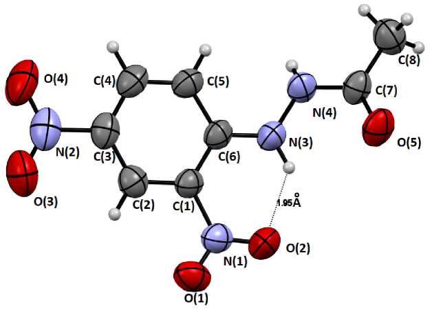 Структура Nʹ-ацетил-N-(2,4-динитрофенил)гидразина ранее уже была исследована методом РСА [10]. Авторами отмечено, что большинство длин связей и углов аналогичны таковым в родственных молекулах и что более сильное скручивание орто -нитрогруппы по отношению к группе гидразона (на 10,0(2) °) возникает из-за внутримолекулярной водородной связи. В нашем случае данный угол составляет 9,84 °, а длина внутримолекулярной водородной связи 1,95 Å (2,001 Å [10]) (рис. 2).