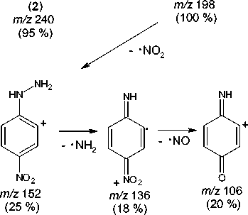 В масс-спектре соединения 2 (рис. 1) пик молекулярного иона соответствует значению его молекулярной массы ( m/z 240) и не является максимально интенсивным, что, по-видимому, связано с образованием стабильного катион-радикала 2,4-динитрофенилгидразина ( m/z 198) при отщеплении CH2CO от молекулярного иона. Подобная фрагментация является характерной для Nʹ-ацетил-фенилгидразинов [24]. Дальнейшая фрагментация катион-радикала 2,4-динитрофенилгидразина протекает согласно описанному в литературе механизму [25] с миграцией двух атомов H из гидразиновой группы в о -нитрогруппу, а последующая потеря воды приводит к образованию фраг-ментного иона с m/z 180, который далее диссоциирует посредством последовательных потерь N2 и NO. Образование пика с m/z 79 может быть связано с последовательным отщеплением радикалов NO 2 , NH 2 , NO и молекулы HCN: