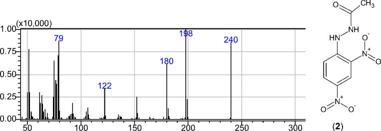 Рис. 1. Масс-спектр Nʹ-ацетил-N-(2,4-динитрофенил)гидразина 2