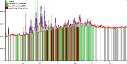 Установлено высокое содержание (суммарно более 99%) в образце двух оксосульфатов висмута, имеющих состав Вi 28 О 32 (SО 4 ) 10 и Вi 34.7 О 100 S 16 . Ни одна из идентифицированных фаз не содержит ни фтора, ни углерода.