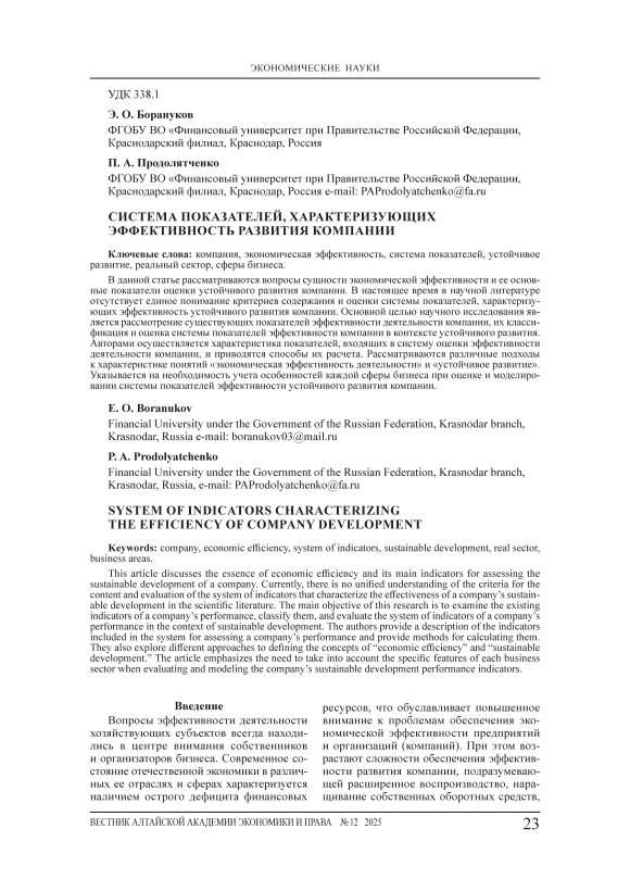 Рассматриваемые в статье вопросы формирования системы показателей, характеризующих эффективность развития компании, требуют комплексного подхода к их разрешению с учетом особенностей деятельности каждой компании. Системы оценки эффективности деятельности компаний должны постоянно совершенствоваться, что обуславливает необходимость фундаментальных исследований затронутой тематики, в результате которых может быть сформирована проработанная и логически выстроенная система показателей, позволяющая контролировать изменяющиеся процессы в компании и своевременно принимать управленческие решения. Для каждого хозяйствующего субъекта необходима собственная система показателей эффективности развития с учетом специфики деятельности, жизненного цикла, стратегии. По каждому показателю, входящему в данную систему, необходимо определять плани- руемые и фактические результаты. Единого набора показателей эффективности развития компаний быть не может. Это подчеркивает потребность осуществления исследований деятельности конкретных предприятий, оценки экономической эффективности достижения имеющихся результатов, разработки критериев и размеров роста в контексте обеспечения устойчивого развития.
