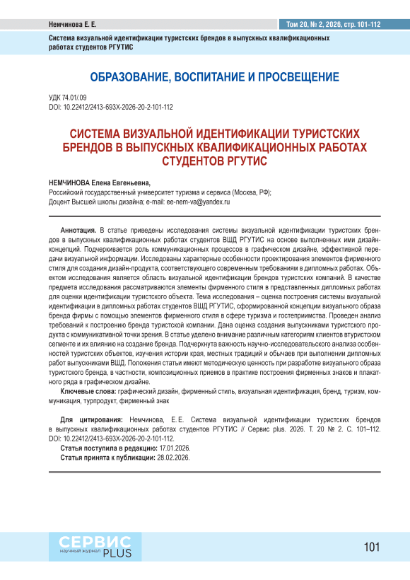 В статье приведены исследования системы визуальной идентификации туристских брендов в выпускных квалификационных работах студентов ВШД РГУТИС на основе выполненных ими дизайн-концепций. Подчеркивается роль коммуникационных процессов в графическом дизайне, эффективной передачи визуальной информации. Исследованы характерные особенности проектирования элементов фирменного стиля для создания дизайн-продукта, соответствующего современным требованиям в дипломных работах. Объектом исследования является область визуальной идентификации брендов туристских компаний. В качестве предмета исследования рассматриваются элементы фирменного стиля в представленных дипломных работах для оценки идентификации туристского объекта. Тема исследования – оценка построения системы визуальной идентификации в дипломных работах студентов ВШД РГУТИС, сформированной концепции визуального образа бренда фирмы с помощью элементов фирменного стиля в сфере туризма и гостеприимства. Проведен анализ требований к построению бренда туристской компании. Дана оценка создания выпускниками туристского продукта с коммуникативной точки зрения. В статье уделено внимание различным категориям клиентов втуристском сегменте и их влиянию на создание бренда. Подчеркнута важность научно-исследовательского анализа особенностей туристских объектов, изучения истории края, местных традиций и обычаев при выполнении дипломных работ выпускниками ВШД. Положения статьи имеют методическую ценность при разработке визуального образа туристского бренда, в частности, композиционных приемов в практике построения фирменных знаков и плакатного ряда в графическом дизайне.