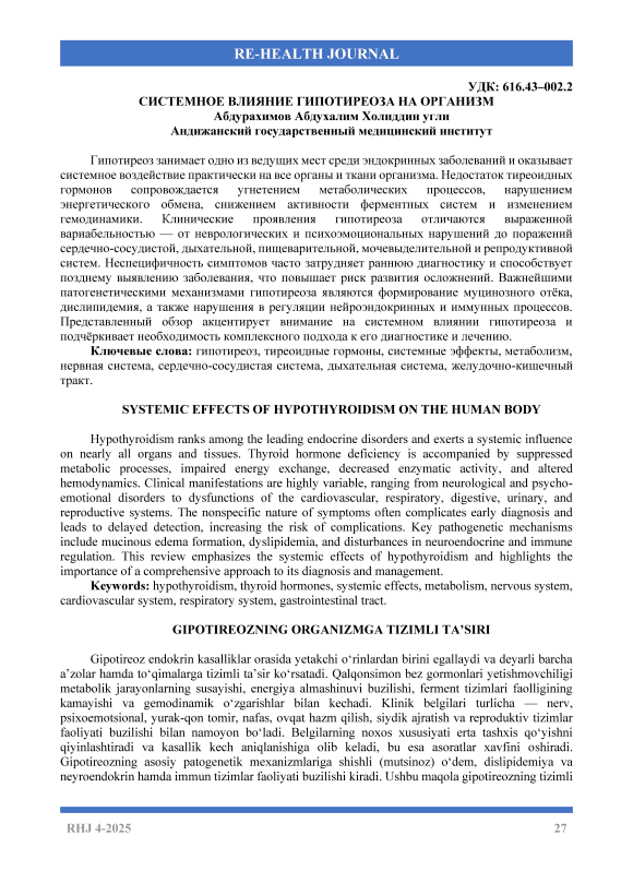 Гипотиреоз занимает одно из ведущих мест среди эндокринных заболеваний и оказывает системное воздействие практически на все органы и ткани организма. Недостаток тиреоидных гормонов сопровождается угнетением метаболических процессов, нарушением энергетического обмена, снижением активности ферментных систем и изменением гемодинамики. Клинические проявления гипотиреоза отличаются выраженной вариабельностью — от неврологических и психоэмоциональных нарушений до поражений сердечно-сосудистой, дыхательной, пищеварительной, мочевыделительной и репродуктивной систем. Неспецифичность симптомов часто затрудняет раннюю диагностику и способствует позднему выявлению заболевания, что повышает риск развития осложнений. Важнейшими патогенетическими механизмами гипотиреоза являются формирование муцинозного отёка, дислипидемия, а также нарушения в регуляции нейроэндокринных и иммунных процессов. Представленный обзор акцентирует внимание на системном влиянии гипотиреоза и подчёркивает необходимость комплексного подхода к его диагностике и лечению.