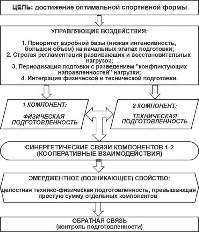 Представленная на рисунке 1 схема, иллюстрирует предлагаемую синергетическую модель. В ее основе лежит отказ от линейного («сверху-вниз») управления отдельными компонентами в пользу создания условий для их кооперативного взаимодействия. Верхний блок - это система научно обоснованных управляющих принципов, которые должны заменить ошибочные эмпирические установки начинающего тренера. Эти принципы направляют развитие двух основных взаимосвязанных компонентов подготовленности спортсмена - физическую и техническую. Двунаправленные воздействия на оба компонента символизи руют постоянные синергетические связи: например, рост силовых показателей (компонент 1) позволяет освоить и стабилизировать более эффективную технику плавания с повышением сопротивления воды (компонент 2). Увеличение эффективности техники снижает энергозатраты, повышая выносливость (обратное влияние компонента 2 на компонент 1). В результате такого нелинейного взаимодействия возникает эмер-джентное, системное свойство - целостная техникофизическая подготовленность пловца, которая не может быть сведена к простой сумме тренировок в воде и в зале. Нижний блок - динамический контроль подготовленности (обратная связь) - обеспечивает коррекцию управляющих воздействий на основе объективных данных (результаты тестов, анализ кинематических и динамических параметров техники), что делает систему гибкой и адаптивной. Данная модель прямо противостоит типичной ошибке - попыткам прямолинейного «натаскивания» на результат через нагрузку средней интенсивности, предлагая вместо этого стратегию создания сложной, внутренне согласованной системы.