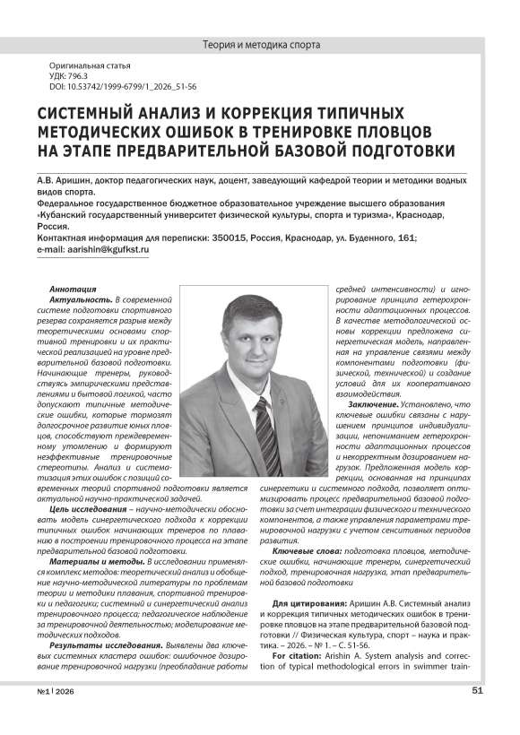 Актуальность. В современной системе подготовки спортивного резерва сохраняется разрыв между теоретическими основами спортивной тренировки и их практической реализацией на уровне предварительной базовой подготовки. Начинающие тренеры, руководствуясь эмпирическими представлениями и бытовой логикой, часто допускают типичные методические ошибки, которые тормозят долгосрочное развитие юных пловцов, способствуют преждевременному утомлению и формируют неэффективные тренировочные стереотипы. Анализ и систематизация этих ошибок с позиций современных теорий спортивной подготовки является актуальной научно-практической задачей. Цель исследования – научно-методически обосновать модель синергетического подхода к коррекции типичных ошибок начинающих тренеров по плаванию в построении тренировочного процесса на этапе предварительной базовой подготовки. Материалы и методы. В исследовании применялся комплекс методов: теоретический анализ и обобщение научно-методической литературы по проблемам теории и методики плавания, спортивной тренировки и педагогики; системный и синергетический анализ тренировочного процесса; педагогическое наблюдение за тренировочной деятельностью; моделирование методических подходов. Результаты исследования. Выявлены два ключевых системных кластера ошибок: ошибочное дозирование тренировочной нагрузки (преобладание работы средней интенсивности) и игнорирование принципа гетерохронности адаптационных процессов. В качестве методологической основы коррекции предложена синергетическая модель, направленная на управление связями между компонентами подготовки (физической, технической) и создание условий для их кооперативного взаимодействия. Заключение. Установлено, что ключевые ошибки связаны с нарушением принципов индивидуализации, непониманием гетерохронности адаптационных процессов и некорректным дозированием нагрузок. Предложенная модель коррекции, основанная на принципах синергетики и системного подхода, позволяет оптимизировать процесс предварительной базовой подготовки за счет интеграции физического и технического компонентов, а также управления параметрами тренировочной нагрузки с учетом сенситивных периодов развития.