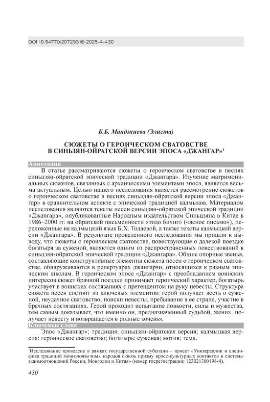 В статье рассматриваются сюжеты о героическом сватовстве в песнях синьцзян-ойратской эпической традиции «Джангара». Изучение матримониальных сюжетов, связанных с архаическими элементами эпоса, является весьма актуальным. Целью нашего исследования является рассмотрение сюжетов о героическом сватовстве в песнях синьцзян-ойратской версии эпоса «Джангар» в сравнительном аспекте с эпической традицией калмыков. Материалом исследования являются тексты песен синьцзян-ойратской эпической традиции «Джангара», опубликованные Народным издательством Синьцзяна в Китае в 1986–2000 гг. на ойратской письменности «тодо бичиг» («ясное письмо»), переложенные на калмыцкий язык Б.Х. Тодаевой, а также тексты калмыцкой версии «Джангара». В результате проведенного исследования мы пришли к выводу, что сюжеты о героическом сватовстве, повествующие о далекой поездке богатыря за суженой, являются одним из распространенных повествований в синьцзян-ойратской эпической традиции «Джангара». Общие опорные звенья, составляющие конструктивные элементы сюжета песен о героическом сватовстве, обнаруживаются в репертуарах джангарчи, относящихся к разным эпическим школам. В героическом эпосе «Джангар» с преобладанием воинских интересов сюжет брачной поездки принимает героический характер, богатырь участвует в воинских состязаниях с претендентом на руку невесты. Структура сюжета песен состоит из ключевых элементов: герой получает весть о суженой, неудачное сватовство, поиски невесты, пребывание в ее стране, участие в брачных состязаниях. Герой проходит испытание ловкости, силы и мужества, тем самым доказывает, что именно он, предназначенный судьбой, жених, получает невесту и возвращается в родные кочевья.