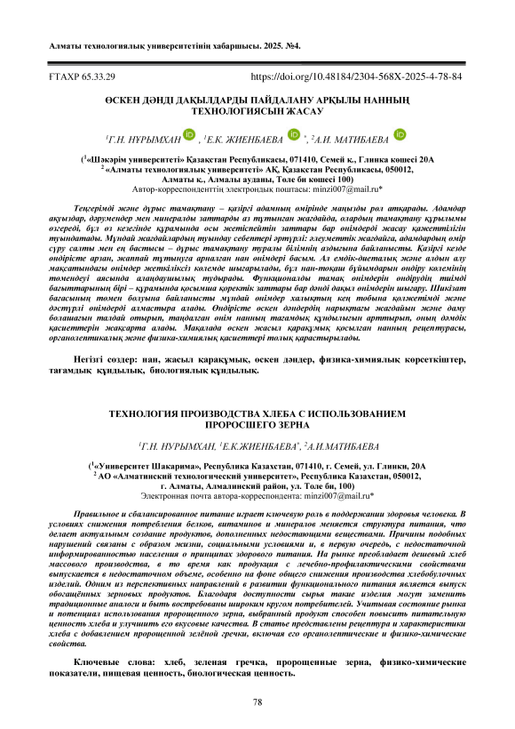 Теңгерімді және дұрыс тамақтану – қазіргі адамның өмірінде маңызды рөл атқарады. Адамдар ақуыздар, дәрумендер мен минералды заттарды аз тұтынған жағдайда, олардың тамақтану құрылымы өзгереді, бұл өз кезегінде құрамында осы жетіспейтін заттары бар өнімдерді жасау қажеттілігін туындатады. Мұндай жағдайлардың туындау себептері әртүрлі: әлеуметтік жағдайға, адамдардың өмір сүру салты мен ең бастысы – дұрыс тамақтану туралы білімнің аздығына байланысты. Қазіргі кезде өндірісте арзан, жаппай тұтынуға арналған нан өнімдері басым. Ал емдік-диеталық және алдын алу мақсатындағы өнімдер жеткіліксіз көлемде шығарылады, бұл нан-тоқаш бұйымдарын өндіру көлемінің төмендеуі аясында алаңдаушылық тудырады. Функционалды тамақ өнімдерін өндірудің тиімді бағыттарының бірі – құрамында қосымша қоректік заттары бар дәнді дақыл өнімдерін шығару. Шикізат бағасының төмен болуына байланысты мұндай өнімдер халықтың кең тобына қолжетімді және дәстүрлі өнімдерді алмастыра алады. Өндірісте өскен дәндердің нарықтағы жағдайын және даму болашағын талдай отырып, таңдалған өнім нанның тағамдық құндылығын арттырып, оның дәмдік қасиеттерін жақсарта алады. Мақалада өскен жасыл қарақұмық қосылған нанның рецептурасы, органолептикалық және физика-химиялық қасиеттері толық қарастырылады.