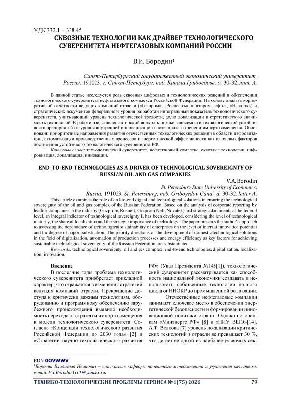 В данной статье исследуется роль сквозных цифровых и технологических решений в обеспечении технологического суверенитета нефтегазового комплекса Российской Федерации. На основе анализа корпоративной отчётности ведущих компаний отрасли («Газпром», «Роснефть», «Газпром нефть», «Новатэк») и стратегических документов федерального уровня разработан интегральный показатель технологического суверенитета, учитывающий уровень технологической зрелости, долю локализации и стратегическую значимость технологий. В работе представлен авторский подход к оценке зависимости технологической устойчивости предприятий от уровня внутренней инновационного потенциала и степени импортозамещения. Обоснованы приоритетные направления развития отечественных технологических решений в области цифровизации, автоматизации производственных процессов и энергетической эффективности как ключевых факторов достижения устойчивого технологического суверенитета РФ.