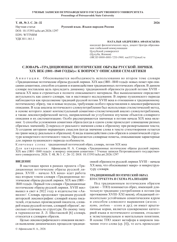 Обосновыв ается необходим ость использования во втором томе словаря «Традиционные поэтические образы русской лирики. XIX век (1801–1840 годы)» новых помет при описании семантики, спо собов создания и взаимодействия традиционных поэтических образов. В данном словаре поставлена цель проследить динамику традиционной образности русской поэзии XVIII – начала XX века и стремиться к полноте описываемого материала. Все вышесказанное определяет актуальность как самого словаря, так и настоящего исследования. В лирике пушкинского периода наблюдаются как продолжение традиций русской поэзии XVIII века в отношении к традиционному поэтическому образу, так и новые подходы, требующие особого представления в лексикографическом описании. В ходе анализа поэтического словоупотребления был использован стилистический метод, в основе которого лежит контекстуальный семантико-стилистический анализ словоупотребления, а также лексикографический метод, направлен ный на углубленное изучение объектов словарного описания и их систематизацию. Особо рассматриваются значимые в поэзии начала XIX века явления: 1) способы усложнения семантики образа (когда в одном слове происходит совмещение разных образных значений); 2) переход от реального значения слова к образному при развертывании текста; 3) создание авторами мерцающих смыслов (когда значение слова в тексте стихотворения остается на грани между реальным и образным); 4) виды взаимодействия слов-образов в семантической структуре конкретного поэтического текста. Предлагаются словарные пометы, описывающие характерные для лирики пушкинского периода особенности.
