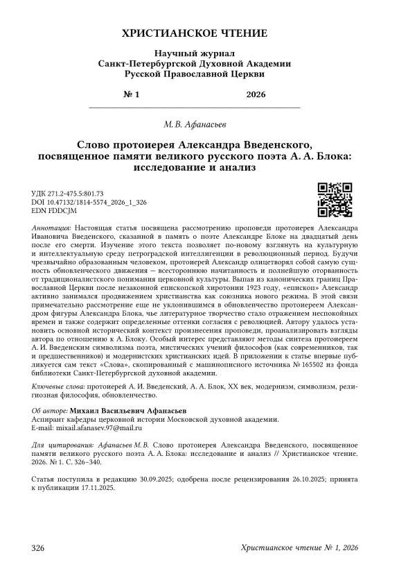 The article presents the study of the sermon of Archpriest Alexander Ivanovich Vvedensky, which was dedicated to memory of the poet Alexander Blok and delivered on the twentieth day after his death. The study of this text allows for a fresh look at the cultural and intellectual environment of Petrograd intelligentsia during the revolutionary period. Being a highly educated person, Archpriest Alexander personified the very essence of the Renovationist movement, i. e. to be comprehensively well-read and completely detached from the traditionalist understanding of church culture. After his illegal episcopal ordination in 1923, “bishop” Alexander was expelled beyond the canonical limits of the Orthodox Church and was actively involved in promoting Christianity as an ally of the new regime. In this regard, it is noteworthy that Archpriest Alexander who had not yet strayed into Renovationism examined the figure of Alexander Blok whose literary work became a reflection of the turbulent times and also contains certain tinges of agreement with the Revolution. Also, in the course of the study of this sermon, it was possible to identify the main historical context of Archpriest Alexander’s sermon and to analyze his views regarding A. Blok. Of particular interest are the methods applied by Archpriest A. I. Vvedensky to synthesize the poet’s symbolism, the mystical teachings of philosophers (both his contemporaries and predecessors) and modernist Christian ideas. Copied from typewritten source No. 165502 from the archive of St. Petersburg Theological Academy, the text of ‘The Word’ is published for the first time in the appendix to the article.