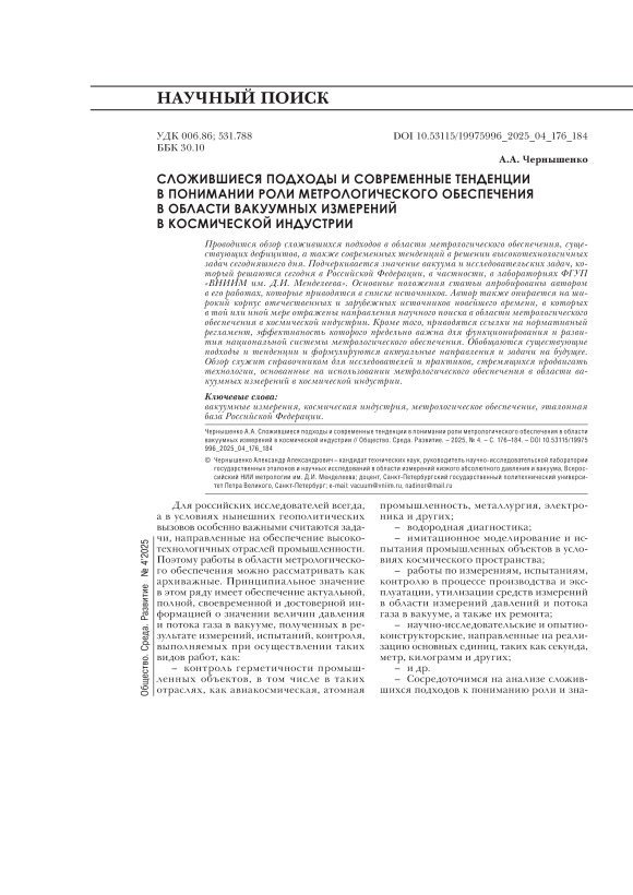 Проводится обзор сложившихся подходов в области метрологического обеспечения, существующих дефицитов, а также современных тенденций в решении высокотехнологичных задач сегодняшнего дня. Подчеркивается значение вакуума и исследовательских задач, который решаются сегодня в Российской Федерации, в частности, в лабораториях ФГУП «ВНИИМ им. Д.И. Менделеева». Основные положения статьи апробированы автором в его работах, которые приводятся в списке источников. Автор также опирается на широкий корпус отечественных и зарубежных источников новейшего времени, в которых в той или иной мере отражены направления научного поиска в области метрологического обеспечения в космической индустрии. Кроме того, приводятся ссылки на нормативный регламент, эффективность которого предельно важна для функционирования и развития национальной системы метрологического обеспечения. Обобщаются существующие подходы и тенденции и формулируются актуальные направления и задачи на будущее. Обзор служит справочником для исследователей и практиков, стремящихся продвигать технологии, основанные на использовании метрологического обеспечения в области вакуумных измерений в космической индустрии.