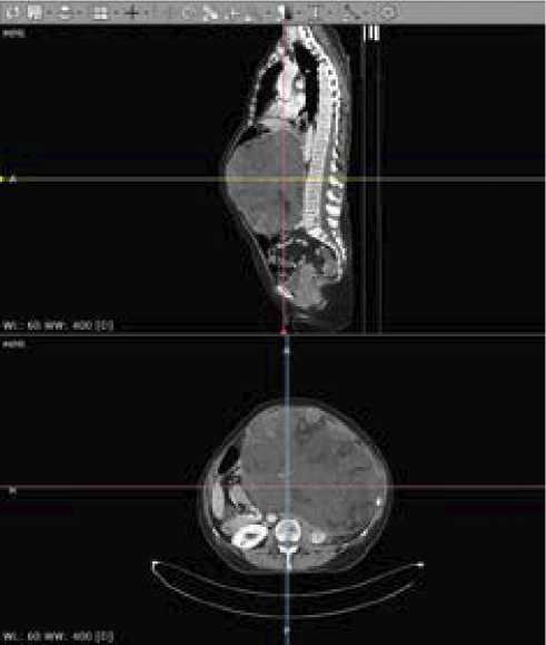 КТ-сканирование с контрастированием за 3 дня до операции выявило,что в центральных и левых отделах брюшной полости есть опухоль размерами 243 × 183 × 244 мм, структура неоднородная — кистозно- солидная с жировыми включениями (рис. 1 и 2). Петли тонкой кишки оттеснены вправо, левая половина поперечной и нисходящая часть ободочной кишки компримированы между новообразованием и передней брюшной стенкой, желудок и поджелудочная железа оттеснены вправо, селезенка — поддиафрагмально. Левая почка деформирована новообразованием, смещена кзади и медиально. Сосудистая ножка почки компримирована, почечная артерия прослеживается, почечная вена четко не дифференцируется. Кортико-медуллярная дифференциация почки сохранена, в прилежащей к опухоли паренхиме почки определяются участки гипоперфузии (компрессионные изменения).