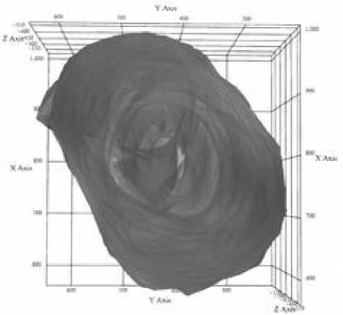 Figure 4. Preoperative 3D modeling опухоли при патологическом исследовании за эталон, то отклонение данных компьютерной томографии составило 20,8%, программы ЭВМ — 1,5%. В ряде исследований получены результаты расчета объема крови в опухоли, проницаемости сосудов и прочих параметров методами магнитно-резонансной томографии.