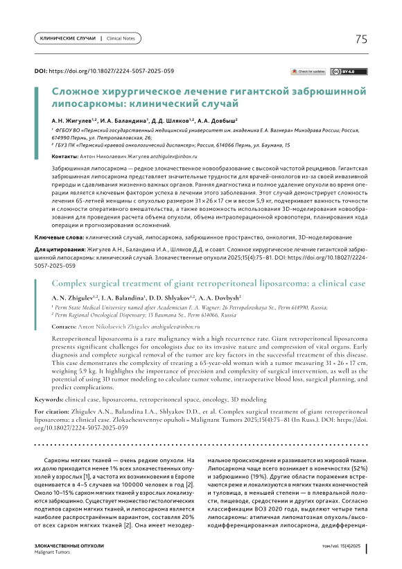 Забрюшинная липосаркома — редкое злокачественное новообразование с высокой частотой рецидивов. Гигантская забрюшинная липосаркома представляет значительные трудности для врачей-онкологов из-за своей инвазивной природы и сдавливания жизненно важных органов. Ранняя диагностика и полное удаление опухоли во время операции является ключевым фактором успеха в лечении этого заболевания. Этот случай демонстрирует сложность лечения 65-летней женщины с опухолью размером 31 × 26 × 17 см и весом 5,9 кг, подчеркивает важность точности и сложности оперативного вмешательства, а также возможность использования 3D-моделирования новообразования для проведения расчета объема опухоли, объема интраоперационной кровопотери, планирования хода операции и прогнозирования осложнений.