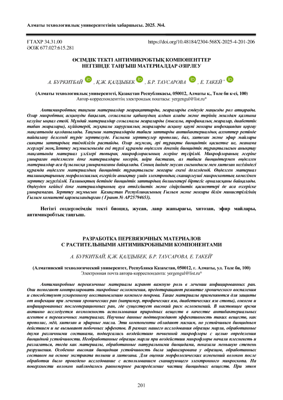 Антимикробтық таңғыш материалдар жарақаттарды, жараларды емдеуде маңызды рөл атқарады. Олар микробтық асқынуды бақылап, созылмалы қабынудың алдын алады және терінің жылдам қалпына келуіне ықпал етеді. Мұндай материалдар созылмалы жараларды (мысалы, трофикалық жаралар, диабеттік табан жаралары), күйіктерді, жұқпалы хирургиялық жараларды асқыну қаупі жоғары инфекциядан қорғау мақсатында қолданылады. Таңғыш материалдарда табиғи заттарды антибактериалдық агенттер ретінде пайдалану белсенді түрде зерттелуде. Ғылыми зерттеулер прополис, бал, хитозан және эфир майлары сияқты заттардың тиімділігін растайды. Олар жұмсақ, әрі тұрақты биоцидтік қасиетке ие, жанама әсерлері жоқ.Зеттеу жұмысымызда екі түрлі құрамда өңделген дәкенің биоцидтік тұрақтылығын анықтау мақсатында материал үлгілері топырақ микрофлорасының әсеріне түсірілді. Микрофлораның әсеріне ұшыраған өңделмеген дәке материалдары көгеріп, шіри бастаған, ал табиғи биоцидтермен өңделген материалдар аса бұзылысқа ұшырамағаны байқалады. Соның ішінде жусан сығындысы мен хитозан негізіндегі құрамда өңделген материалдың биоцидтік тұрақтылығы жоғары екені дәлелденді. Өңделген материал талшықтарының морфологиялық өзгерісін анықтау үшін электрондық сканирлеуші микроскоптың көмегімен зерттеу жүргізілді. Талшықтың бетінде биоцидтік заттардың бөлшектері біртегіс орналасқаны байқалады. Өңдеуден кейінгі дәке материалдарының ауа өткізгіштік және сіңіргіштік қасиеттері де аса өзгеріске ұшырамаған.