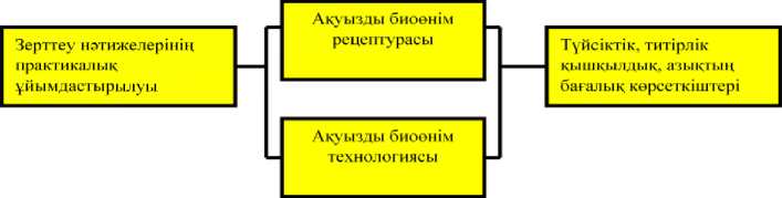 Жүргізілген зерттеу нәтижелері бойын-ша, итмұрын мен таңқурай шәрбәттерін 10% мөлшерде қосу өнімнің дәмдік және иістік қасиеттерін жақсартатыны анықталды. Алайда дәмдеуіштердің мөлшері 15%-ға жеткенде, әсіресе итмұрын шәрбәті қолданылғанда, өнімнің дәмдік сапасы төмендейтіні байқалды. Зерттеу нәтижесінде алынған ақуызды био-өнімнің тағамдық құрамы келесідей болды: ақуыздар – 26,7 г, майлар – 9 г, көмірсулар – 9,4 г, органикалық қышқылдар – 1 г, күл – 1 г. Минералдық заттар бойынша натрий – 41 мг, калий – 112 мг, кальций – 104 мг, магний – 23 мг мөлшерінде анықталды. Сонымен қатар, өнімде В1, В2, РР, С, Е топтарының дәрумендері тіркелді. Өнімнің энергетикалық құндылығы 178 ккал құрады.