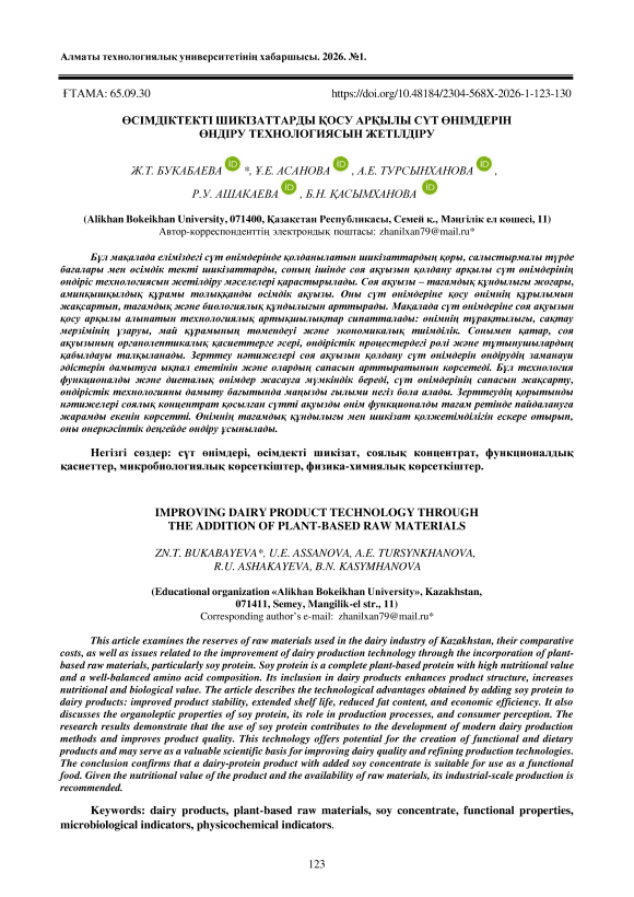 Бұл мақалада еліміздегі сүт өнімдерінде қолданылатын шикізаттардың қоры, салыстырмалы түрде бағалары мен өсімдік текті шикізаттарды, соның ішінде соя ақуызын қолдану арқылы сүт өнімдерінің өндіріс технологиясын жетілдіру мәселелері қарастырылады. Соя ақуызы – тағамдық құндылығы жоғары, аминқышқылдық құрамы толыққанды өсімдік ақуызы. Оны сүт өнімдеріне қосу өнімнің құрылымын жақсартып, тағамдық және биологиялық құндылығын арттырады. Мақалада сүт өнімдеріне соя ақуызын қосу арқылы алынатын технологиялық артықшылықтар сипатталады: өнімнің тұрақтылығы, сақтау мерзімінің ұзаруы, май құрамының төмендеуі және экономикалық тиімділік. Сонымен қатар, соя ақуызының органолептикалық қасиеттерге әсері, өндірістік процестердегі рөлі және тұтынушылардың қабылдауы талқыланады. Зерттеу нәтижелері соя ақуызын қолдану сүт өнімдерін өндірудің заманауи әдістерін дамытуға ықпал ететінін және олардың сапасын арттыратынын көрсетеді. Бұл технология функционалды және диеталық өнімдер жасауға мүмкіндік береді, сүт өнімдерінің сапасын жақсарту, өндірістік технологияны дамыту бағытында маңызды ғылыми негіз бола алады. Зерттеудің қорытынды нәтижелері соялық концентрат қосылған сүтті ақуызды өнім функционалды тағам ретінде пайдалануға жарамды екенін көрсетті. Өнімнің тағамдық құндылығы мен шикізат қолжетімділігін ескере отырып, оны өнеркәсіптік деңгейде өндіру ұсынылады.