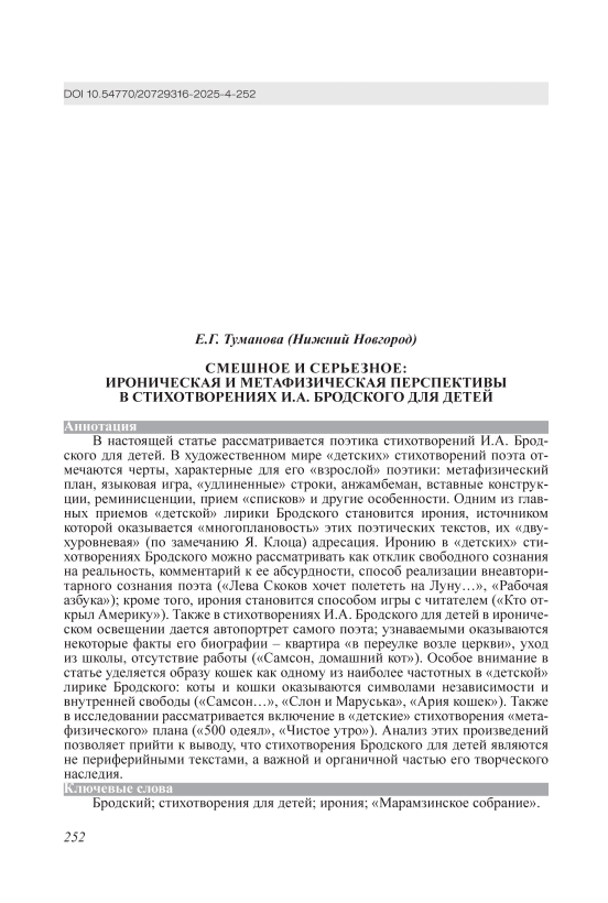Смешное и серьезное: ироническая и метафизическая перспективы в стихотворениях И.А. Бродского для детей