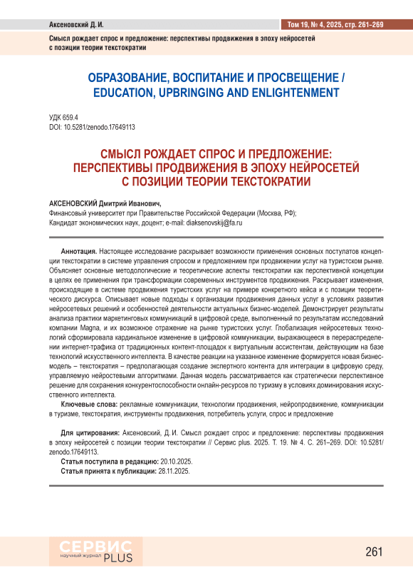 Настоящее исследование раскрывает возможности применения основных постулатов концепции текстократии в системе управления спросом и предложением при продвижении услуг на туристском рынке. Объясняет основные методологические и теоретические аспекты текстократии как перспективной концепции в целях ее применения при трансформации современных инструментов продвижения. Раскрывает изменения, происходящие в системе продвижения туристских услуг на примере конкретного кейса и с позиции теоретического дискурса. Описывает новые подходы к организации продвижения данных услуг в условиях развития нейросетевых решений и особенностей деятельности актуальных бизнесмоделей. Демонстрирует результаты анализа практики маркетинговых коммуникаций в цифровой среде, выполненный по результатам исследований компании Magna, и их возможное отражение на рынке туристских услуг. Глобализация нейросетевых технологий сформировала кардинальное изменение в цифровой коммуникации, выражающееся в перераспределении интернеттрафика от традиционных контентплощадок к виртуальным ассистентам, действующим на базе технологий искусственного интеллекта. В качестве реакции на указанное изменение формируется новая бизнесмодель – текстократия – предполагающая создание экспертного контента для интеграции в цифровую среду, управляемую нейростевыми алгоритмами. Данная модель рассматривается как стратегически перспективное решение для сохранения конкурентоспособности онлайнресурсов по туризму в условиях доминирования искусственного интеллекта.