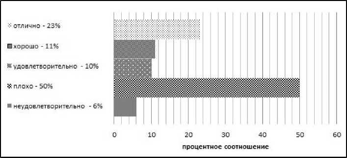 Восприятие скорости и времени сильно искажено у большинства учеников автошколы, и по нашей оценочной методике около половины респондентов демонстрируют в этих параметрах плохие результаты, однако крайне неудовлетворительные значения встречаются достаточно редко и составляют от 4 до 6 % (рис. 1 и 2).