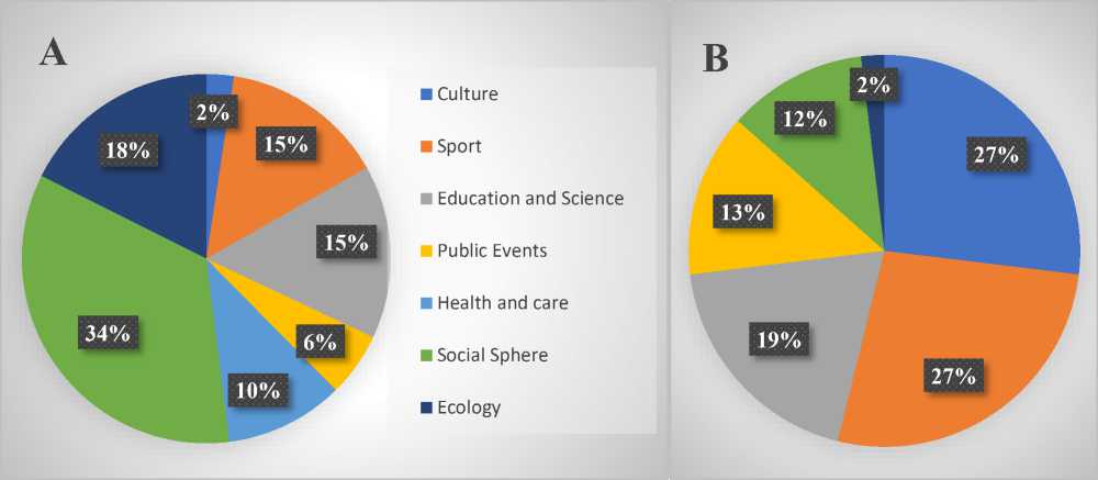Fig. 2. Structure of social activities conducted in 2023: a) JSC Severalmaz in the Primorskiy Municipal District, b) LLC LUKOIL-Komi in the Ust-Tsilemskiy Municipal District, % 16.