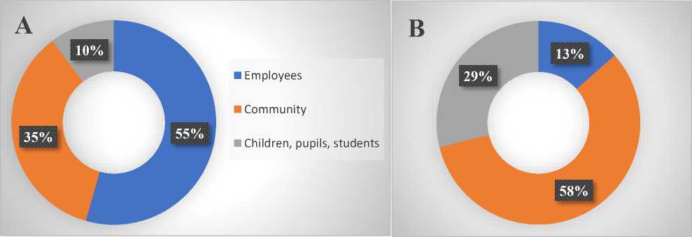 Fig. 3. Social activity of companies in 2023 in terms of beneficiaries of the effects: a) Severalmaz in the Primorskiy Municipal District, b) LUKOIL-Komi in the Ust-Tsilemskiy Municipal District 19.