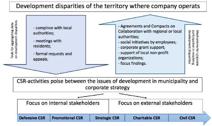 This work is licensed under a CC BY-SA License strategies, such as the Strategy for Spatial Development 1. For the Arctic Zone of the Russian Federation (hereinafter referred to as the AZRF), extractive companies are not only a growth driver, but also a primary factor in regional development [1, Shelomentsev A.G., Doroshenko S.V., Dzhabiev V.V. et al., pp. 13–14; 2, Minaev Yu.N.; 3, Agarkov S.A., Ivanova M.V.]. However, the activities of extractive companies are most critical for rural settlements in the Arctic. Due to the remoteness of municipalities from each other, low population density and its uneven distribution [4, Korchak E.A., p. 123], as well as difficult climatic conditions for effective agriculture [5, Samarina V.P., Skufina T.P.], resource enterprises are the main driver of growth and often the only basis for the existence of a municipal entity. At the same time, there are about 16 municipal okrugs and districts (20% of all municipal formations in the AZRF) where only the rural population lives 2 [6, Yakusheva U.E., Maksimov A.M., Malygina M.V., p. 191]. The importance of partnership between business, the rural population and the authorities is identified as one of the principles for achieving the goals of the Strategy for the Sustainable Development of Rural Areas of the Russian Federation for the Period until 2030 3. However, the most interesting aspect to consider is the social impact created in the process of this interaction, as well as the formation of a mechanism as a result of the company’s implementation of social policy within the framework of corporate social responsibility (hereinafter referred to as CSR). The dichotomy of CSR lies in the company’s performance of some of the social functions initially assigned to the state, and in this case, to municipal authorities, limited in budget formation due to “centralization” and the transfer of the bulk of taxes to the regional and federal levels [7, Lytkina T.S., Yaroshenko S.S., pp. 106, 116]. This situation serves as a prerequisite for the formation of an institution in the form of corporate social responsibility within rural settlements, often to ensure the viability of the rural area.
